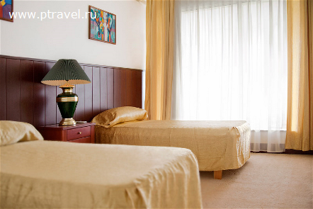 2-местный 2-комнатный "Люкс". Две комнаты - прихожая, гостиная, спальня, балкон. Прихожая — встроенный шкаф, Гостиная - мягкая мебель (диван, два кресла), журнальный столик, туалетный столик, подставка под телевизор, телевизор, холодильник, телефон, сплит-система, встроенный шкаф. В спальне 2 кровати (120-200 см), тумбочка, телевизор, санузел совмещенный с ванной.