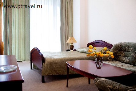 2-местный 1-комнатный повышенной комфортности. Одна комната, прихожая — встроенный шкаф, балкон, 2 кровати, 2 тумбочки, 2 кресла, журнальный столик, туалетный столик, пол с ковровым покрытием, санузел, совмещенный с ванной, цветной телевизор, холодильник, телефон, сплит-система.
