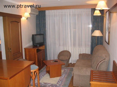 2-местные 2-комнатные номера с удобствами: ванная комната (ванна, туалет, умывальник, фен), ТВ, холодильник, кондиционер, телефон, гостиная с мягкой мебелью, спальня с двуспальной кроватью.