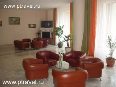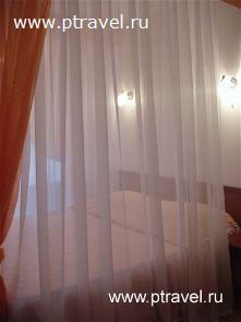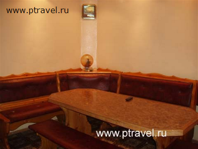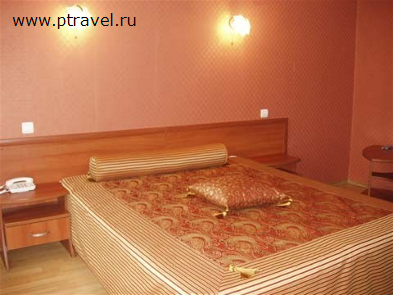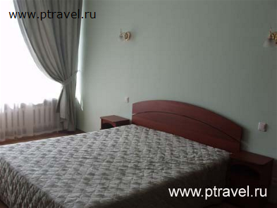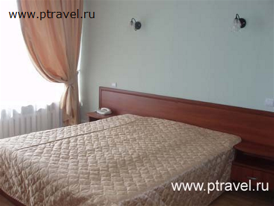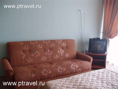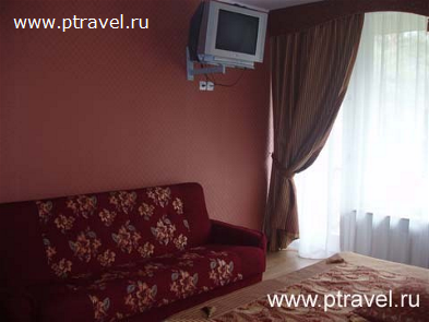 2-комнатный номер с большой гостиной (2 номера): в спальне двуспальная кровать, большая гостиная проходная с диваном-кроватью, обеденный стол, холодильник, цветной телевизор (спутниковое телевидение НТВ), телефон с выходом на Москву, электрический чайник, ванная комната.