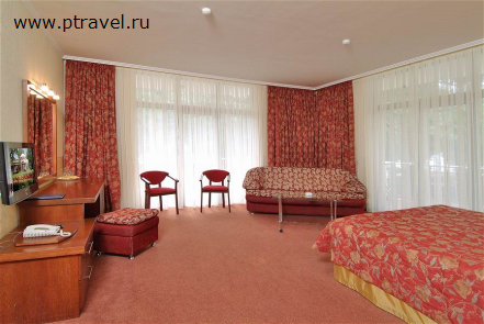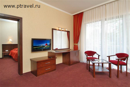2-местный 2-комнатный «Люкс»: две комнаты - спальня с большой кроватью и гостиная; индивидуальная система кондиционирования; телевизор; телефон; два санузла - один гостевой с душевой кабиной , второй для проживающих с большой угловой ванной; выход на террасу или балкон.