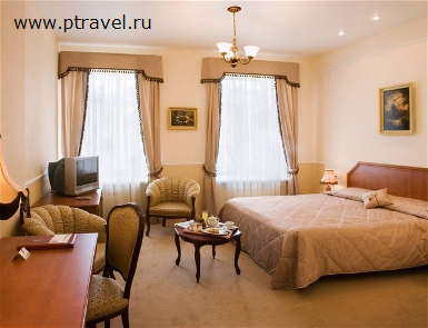 В комнате: кровать, прикроватные тумбочки, туалетный столик с зеркалом, кресла с журнальным столиком, мини-бар, телевизор, телефон, климатическая установка, сейф, выход в Интернет. Номера с кроватями «King size» и «Twin beds». Возможно размещение 3-го спального места (еврораскладушка или детская кроватка).