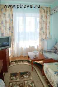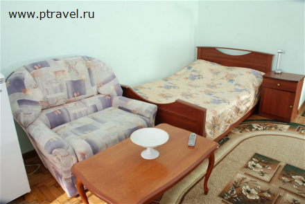 1-местные номера (кровать 1,5 сп., комплект-кресло, пуфик, тумба прикроватная, ТВ, журнальный столик, стол туалетный с зеркалом, встроенный шкаф, холодильник, телефон междугородный, международный, санузел с ванной);