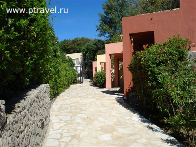 - Deluxe Bungalow Suite (70 кв.м) - стоящие в ряд мезонеты на пляже. Типично коринфская вилла: на 1 этаже - спальня, гостиная и столовая открытого типа, обставленные мебелью из черного металла ручной работы. Пол из натурального дерева и дорогие ткани с цветочным узором. Мраморные ванные и гардеробные комнаты. Мини-бар, TV. Терраса выложена местным камнем. На верхнем этаже находится главная спальная комната в романтическом стиле. Просторные, большие деревянные шкафы и ванная комната с двойным умывальником. Балкон с видом на пляж.
