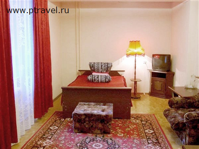 В номерах полулюкс: двуспальные кровати, мягкая мебель, ТВ, холодильник, электрочайник, набор посуды, санузел с душем, сантехника импортная.