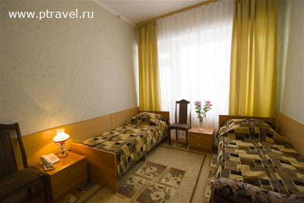 - 2-местный 1-комнатный "Стандарт": 12 кв.м., односпальная кровать 2 шт, прикроватные тумбочки, шкаф, стол, стулья, кабельное телевидение (30 каналов), холодильник, санузел: с душем.