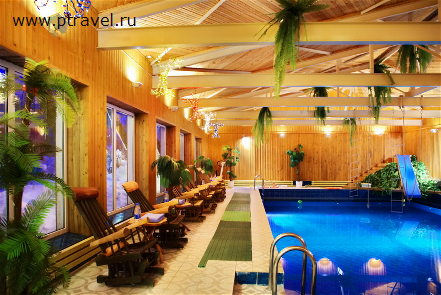- закрытый бассейн с противотоком, водной горкой и летним пляжем