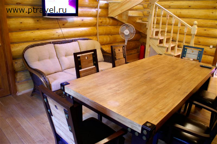 Коттедж с русской баней рассчитанный на 4х человек. Двухэтажный банный комплекс. Первый этаж: русская парная, бассейн с холодной водой 2х2 м, душевая кабина, санузел, холл для отдыха, мини-бар, плазменная панель, DVD, караоке, выход в большой бассейн. Второй этаж: зона отдыха, спальня, балкон, душевая кабина, совмещенная с санузлом.