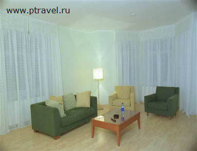 В номере: кровать шириной 180 см, 2 прикроватные тумбы, 2 настольные лампы, трюмо, диван, кресло, банкетка, журнальный столик, шкаф для одежды, телевизор, холодильник, телефон.