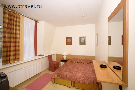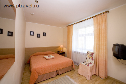 В номере: кровать шириной 120 см, прикроватная тумба, настольная лампа, стул, шкаф для одежды, большое зеркало, телевизор, телефон.