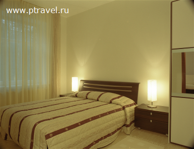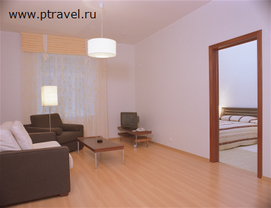 В гостиной: диван-кровать, 2 кресла, журнальный столик, торшер, телевизор, телефон. В спальне: кровать шириной 160 см, 2 прикроватные тумбы, 2 настольные лампы, шкаф для одежды.