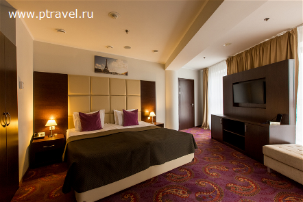 2-местный 1-комнатный "Комфорт". Номер расположен в главном корпусе гостиничного комплекса. Ванная комната оборудована ванной/душевой кабиной и биде. Номер оснащен плазменной панелью со спутниковыми каналами, WI-FI, мини-баром, телефоном, кондиционером, гладильной доской и утюгом, сейфом, весами, чайником и набором для приготовления чая, косметическими средствами, феном, халатом и тапочками, зеркалом для макияжа.