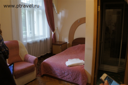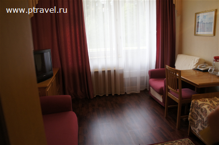 - 1-комнатные 2-местные номера «Стандартные» (2 кресла): санузел (ванна или душ), многоканальное телевидение, радио, телефон с выходом на международную связь, холодильник, журнальные столы, чайная посуда, стулья, выход на балкон или на первом этаже 2-го корпуса - выход из номера в парк;