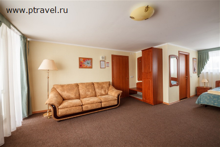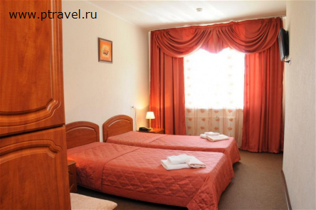2-местный 1-комнатный "Полулюкс". Номер с одной двуспальной кроватью (или две 1,5 кровати) прикроватные тумбочки, туалетный столик с зеркалом, стул, шкаф, телевизор, холодильник, совмещенный санузел (туалет, душевая кабина, фен кроме корпусов 9,10, косметические принадлежности).
