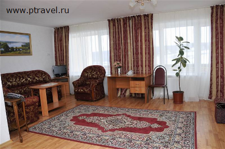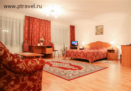 В номере: гостиная комната с мягкой мебелью (2 кресла и диван со спальным местом), журнальным столиком, письменным столом, стульями, телевизором, холодильником. Просторная лоджия с видом на озеро и березовую рощу. Спальня с двуспальной кроватью, туалетным столиком, стенным шкафом, тумбочками, телевизором, балкон.