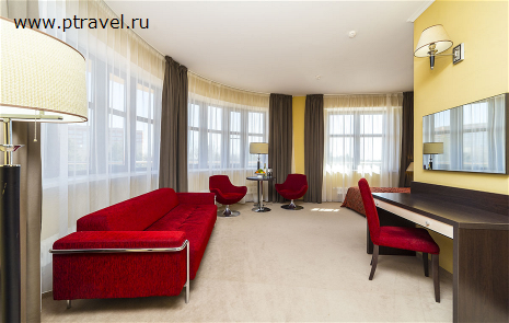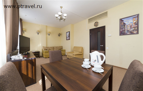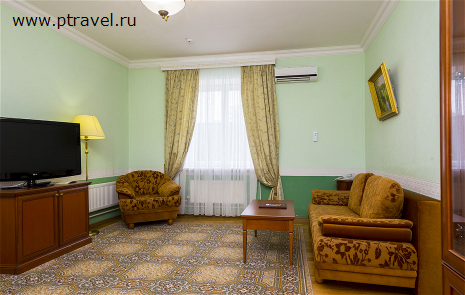 В номере: лоджия, кондиционер, меблирован в классическом стиле, в просторной гостиной мягкая мебель, телевизор, в спальне – двухспальная кровать. В уютной кухне, электрочайник, холодильник, посуда, столовые приборы на 6 персон. В номере два санузла с угловой ванной, стиральной машиной-автомат, феном. Площадь номера 95 кв. м.