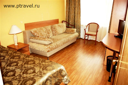 В номере: две изолированные комнаты, обставленные современной мебелью (3 кровати и диван), есть телевизор, телефон, холодильник, лоджия. В туалетной комнате – душевая кабина. Площадь номера 37 кв. м.