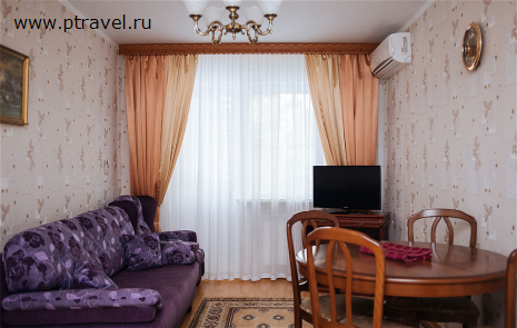 Номер квартирного типа с лоджией, прекрасно меблированный площадью 62 кв. м. В гостиной телевизор, мягкая мебель, в горке столовый сервиз. В одной спальной комнате две односпальные кровати, в другой – двухспальная. На кухне холодильник, электроплита, кухонный гарнитур. В номере 2 санузла с ванной и душевой кабиной, есть стиральная машина-автомат.