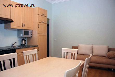 Апартаменты на 6 чел. (2+2+2).Большие апартаменты с двумя спальнями, жилой комнатой с кухонным уголком, гардеробной комнатой и ванной, 55 м2, на первом этаже здания. Есть спутниковое ТВ, компьютер с интернетом и МФЦ (принтер, копир, сканер). Стиральная машина.