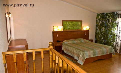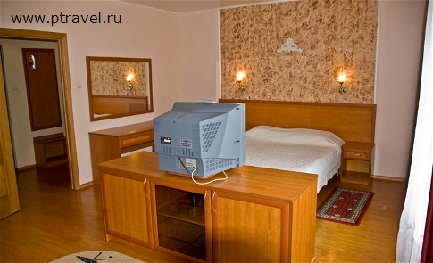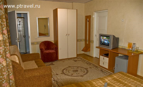 В номере: двуспальная кровать, прикроватные тумбочки и бра, 2-х секционный шкаф для одежды, диван-книжка, журнальный столик, телевизор (диагональ 54 см), телефон, кресло, мини-бар, ванная, туалетные принадлежности, фен.