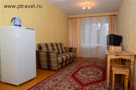 1-комнатый 2-местный номер(13 м.кв.) с двумя кроватями, подвесной полкой, шкафом, столом, стульями, двумя тумбочками, ТВ и холодильником; сантехнические услуги в номере.