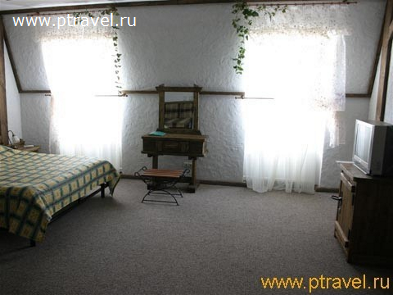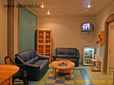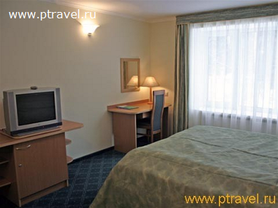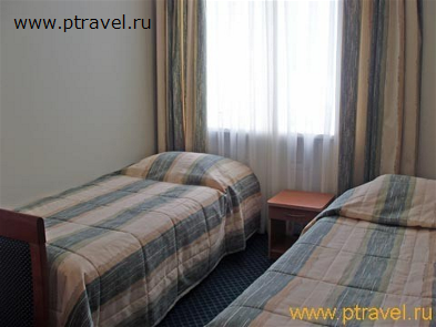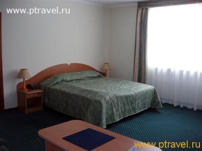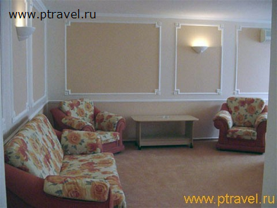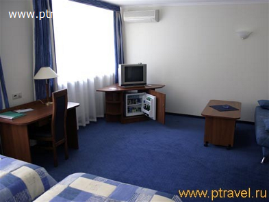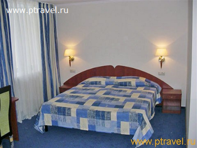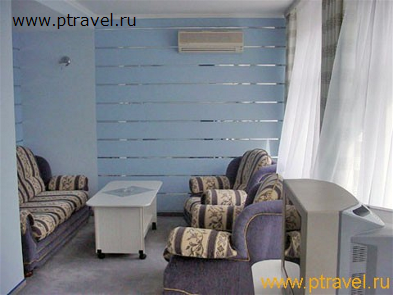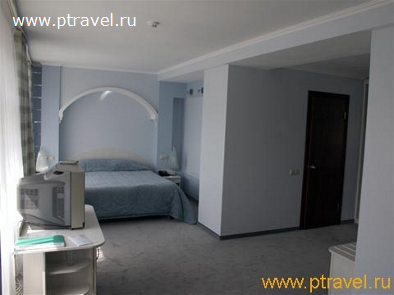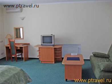 - 2-местные 2-комнатные номера «Сьют» (8 номеров): 2 ТВ, 2-спальная кровать, две 1,5-спальные кровати, диван, журнальный и письменный стол; ванна. Гардины и покрывала - в сине-зеленой гамме.