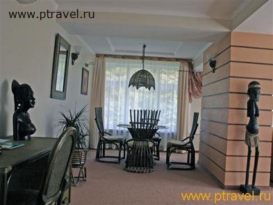 - 2-местный именной люкс «Африканский»: обеденный гарнитур; журнальный столик, 2-спальная кровать, трюмо. Номер выполнен в тонах африканской саванны с элементами национального декора.