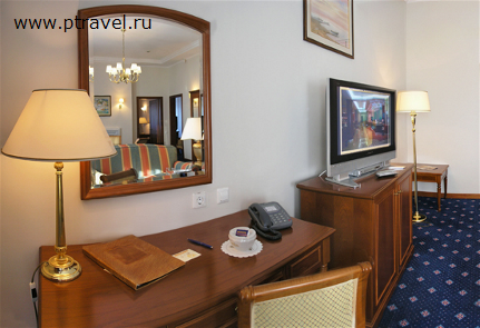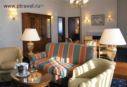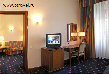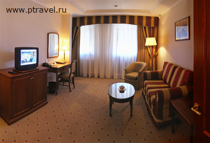 Люкс Классический. Двухкомнатный номер средней площадью 39 кв.м. с двумя санузлами. Вид на город либо парк отеля. Ширина кроватей Twin - 110 см. Каждый номер дополнительно укомплектован раскладным диваном. Есть возможность дополнительного размещения. Количество номеров – 4.