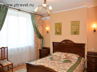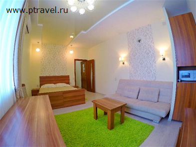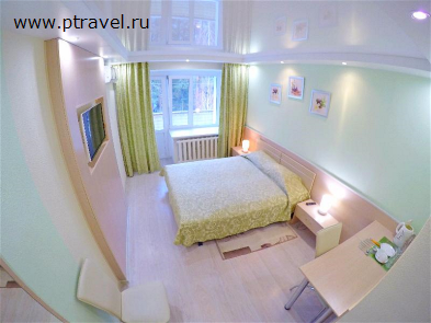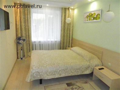 - 2-местный 1-комнатный повышенной комфортности, без балкона, северная сторона: одна комната S=18 м2, телевизор, холодильник, электрочайник, посуда, 2 односпальные кровати, два стула, стол, встроенный шкаф-купе, санузел с душ-поддоном