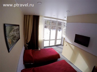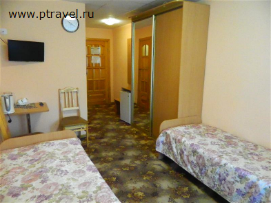 - 2-местный 1-комнатный : одна комната S=12 м2, балкон, телевизор, холодильник, электрочайник, шкаф-купе, 2 односпальные кровати, санузел c мини ванной
