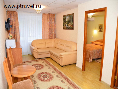 - 2-местный 2-комнатный «Люкс»: две комнаты S=31 м2, балкон, журнальный столик, шкаф-купе, гладильная доска, кондиционер, микроволновая печь, посуда, телевизор, утюг, фен, холодильник, электрочайник, мягкая мебель, спальный гарнитур с 2-х спальной кроватью, санузел с ванной.