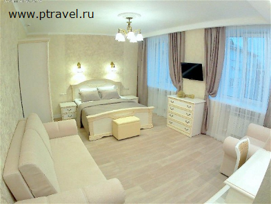 - 2-местный 2-комнатный «Супер-Люкс» №47: S=40 м2, без балкона, с ванной, шкафом-купе, гладильной доской, кондиционером, микроволновой печью, посудой, телевизором, утюгом, феном, холодильником, электрочайником, мягкой мебелью, спальным гарнитуром с 2-х спальной кроватью.