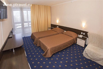 - 2-местный 1-комнатный "Стандарт" (Ая-СТ1). Однокомнатный номер с балконом, кондиционер. Площадь 13-20 кв.м. Две односпальные кровати, тумбочки, шкаф, письменный стол, ТВ, фен, мини-холодильник. Туалетная комната: WC, раковина, душ. 2 осн. места +доп.место (кресло)не везде, по запросу (раскладная кровать).
