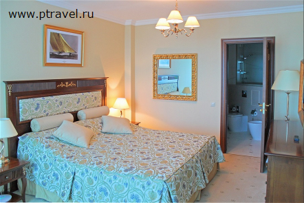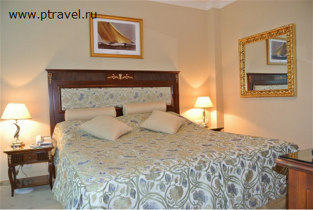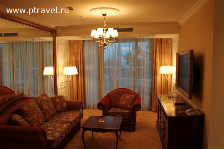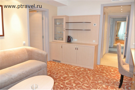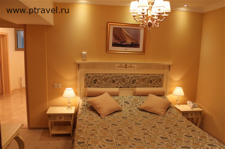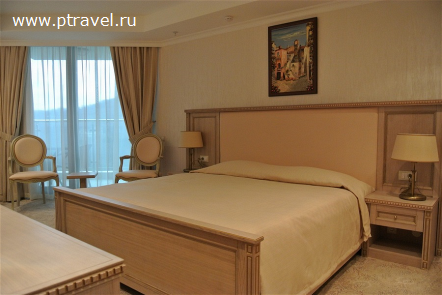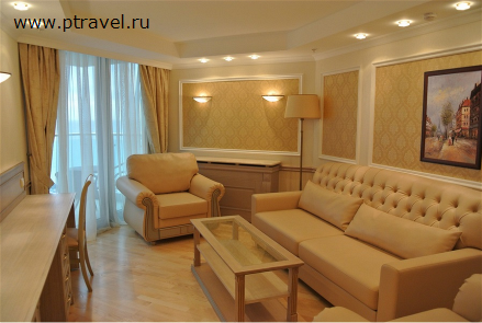 Номер состоит из прихожей, гостиной, спальни, двух санузлов, двух лоджий. В спальне имеются кровать (ширина 1,8 м), две прикроватные тумбочки, платяной шкаф, туалетный стол с зеркалом, пуф, журнальный столик, два кресла, консоль, TV-плазма. В гостиной: диван раскладной, кресло, зеркало во всю стену, журнальный стол, тумба под ТV с полками, TV-плазма. Сан.узлы оснащены ванной, душевой кабиной, унитазом, биде, раковиной с большой столешницей, большим зеркалом, феном, поворотным зеркалом. В прихожей: платяной шкаф, багажница, вешалка, зеркало. На лоджиях мебель из искусственного ротанга: 2 шезлонга, стол, два кресла, солнцезащитный зонт.