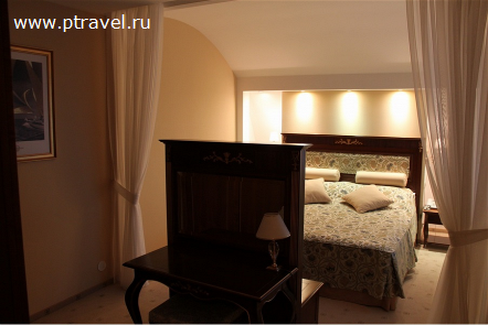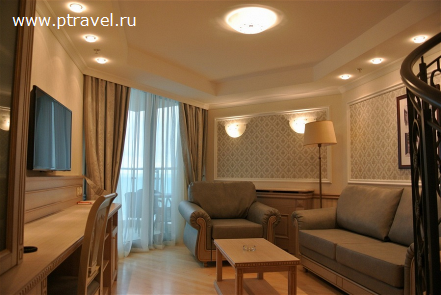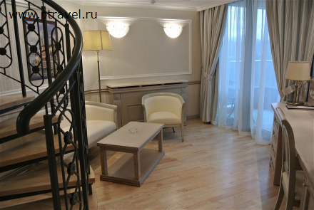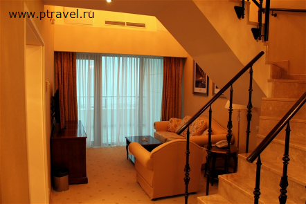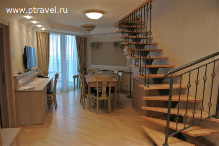 Номер с кондиционером, состоит из 2 комнат (гостиной и спальни), прихожей, 2 санузлов, 2 балконов. На первом этаже расположены гостиная, санузел, прихожая. В гостиной - журнальный стол, стол под TV, 4 кресла, телевизор, телефон, сервант с набором посуды, холодильник, торшер. В прихожей - встроенный и двустворчатый шкафы. На втором этаже расположена спальня с санузлом. В спальне - двуспальная кровать, 3 кресла, письменный стол, прикроватная тумбочка с радиопанелью, телефон, фен. Санузел на первом этаже оснащен умывальником, унитазом; санузел второго этажа оснащен ванной с душем, умывальником и бидэ. На балконах установлена балконная мебель: стол с двумя стульями.