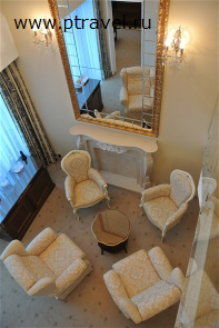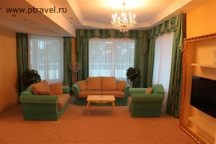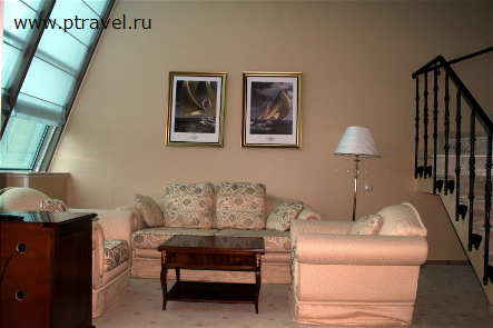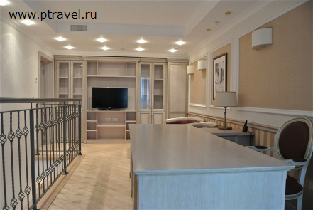 Номер с кондиционером, состоит из 4 комнат , 2 прихожих, 2 санузлов и 4 балконов. На первом этаже расположены гостиная, 2 спальни, 2 санузла, 2 прихожих. В гостиной установлены 3 журнальных стола, стол под TV, 6 кресел, встроенный шкаф, сервант с набором посуды, холодильник, телевизор, торшер. В первой спальне - 2 односпальные кровати, кресло, стул, письменный стол, тумбочка с радиопанелью, телефон, торшер, фен. Во второй спальне - двуспальная кровать, прикроватная тумбочка, тумбочка с радиопанелью, журнальный стол, 2 кресла, письменный стол, стул, телефон. Санузлы оборудованы ванной с душем, умывальником, унитазом, бидэ. Первая прихожая оборудована встроенным шкафом, вторая - гардеробной стенкой. На втором этаже расположена комната-кабинет с двумя рабочими столами, письменным столом, десятью легкими стульями, шкафами - двустворчатым и книжным, телефоном, торшером. На балконах установлена балконная мебель: стол с 2 стульями.