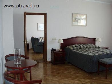 В 2-комнатных 2-местных номерах: ванная комната (ванна, умывальник), спальня с двуспальной кроватью, гостиная (без балкона), ТВ, холодильник-минибар.