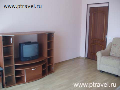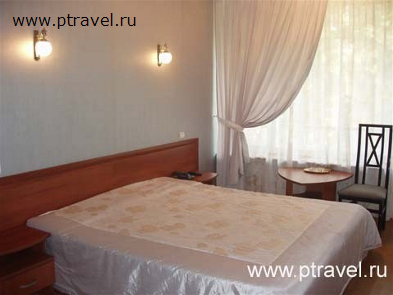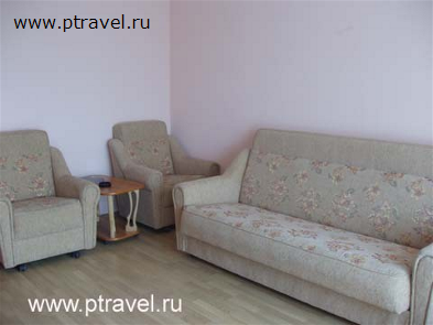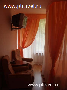 2-комнатный номер с большой гостиной (2 номера): в спальне двуспальная кровать, большая гостиная проходная с диваном-кроватью, обеденный стол, холодильник, цветной телевизор (спутниковое телевидение НТВ), телефон с выходом на Москву, электрический чайник, ванная комната.