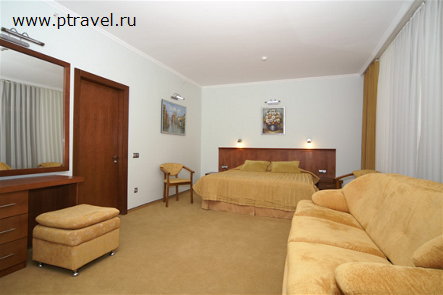 2-местный 2-комнатный «Люкс»: две комнаты - спальня с большой кроватью и гостиная; индивидуальная система кондиционирования; телевизор; телефон; два санузла - один гостевой с душевой кабиной , второй для проживающих с большой угловой ванной; выход на террасу или балкон.