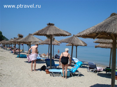 Песчаный, лежаки на пляже и у бассейна - платно, зонтики - бесплатно.