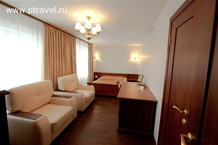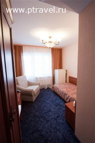 - 2-местный 1-комнатный. Площадь номера: 30,6 метров. Основных мест – 2, Доп. мест – 2 (кресло-кровать). Мебель в номере: односпальная кровать, кресло, прикроватные тумбочки, сервант. Оборудование: телевизор ЖК, мини-холодильник, телефон, электрочайник, набор посуды. Санузел оборудован душем. В номере – балкон. Ежедневный сервис: уборка номера, смена постельного белья, смена полотенец.