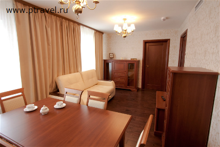 - 2-местный 3-комнатный "Люкс". Кол-во номеров: 6. Площадь номера: 50.4 метров. Основных мест – 2, Доп. мест – 2 (диван). Мебель в номере: двухспальная кровать, диван, прикроватные тумбочки, сервант, журн. стол. Оборудование: система общего кондиционирования, телевизор ЖК, мини-холодильник, телефон, электрочайник, набор посуды. 2 санузла: один оборудован душем, второй оборудован ванной с джакузи. В номере – балкон. Ежедневный сервис: уборка номера, смена постельного белья, смена полотенец.