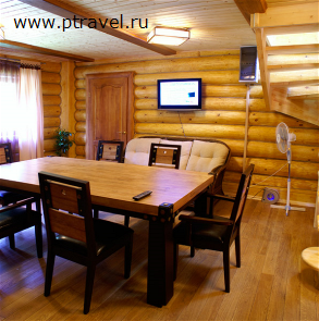 Коттедж с русской баней рассчитанный на 4х человек. Двухэтажный банный комплекс. Первый этаж: русская парная, бассейн с холодной водой 2х2 м, душевая кабина, санузел, холл для отдыха, мини-бар, плазменная панель, DVD, караоке, выход в большой бассейн. Второй этаж: зона отдыха, спальня, балкон, душевая кабина, совмещенная с санузлом.