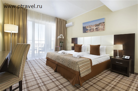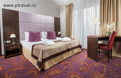 2-местный 1-комнатный "Комфорт". Номер расположен в главном корпусе гостиничного комплекса. Ванная комната оборудована ванной/душевой кабиной и биде. Номер оснащен плазменной панелью со спутниковыми каналами, WI-FI, мини-баром, телефоном, кондиционером, гладильной доской и утюгом, сейфом, весами, чайником и набором для приготовления чая, косметическими средствами, феном, халатом и тапочками, зеркалом для макияжа.