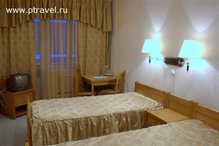 В 2-местных номерах категории «Стандарт» (S номера от 16 до 20 кв.м.): две односпальные кровати, прикроватные тумбочки, телевизор, холодильник, лоджия. В ванной комнате: душевая кабина, туалет, раковина.