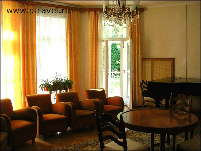 - 1-комнатные 2-местные номера «Стандартные» (2 кресла): санузел (ванна или душ), многоканальное телевидение, радио, телефон с выходом на международную связь, холодильник, журнальные столы, чайная посуда, стулья, выход на балкон или на первом этаже 2-го корпуса - выход из номера в парк;
