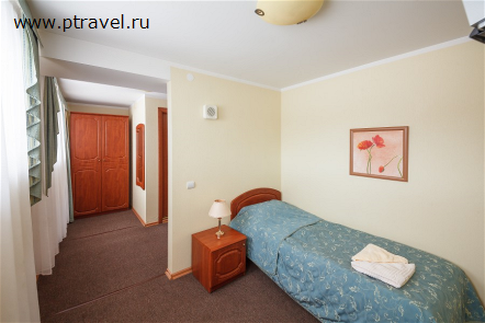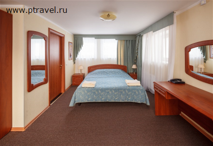 2-местный 1-комнатный "Полулюкс". Номер с одной двуспальной кроватью (или две 1,5 кровати) прикроватные тумбочки, туалетный столик с зеркалом, стул, шкаф, телевизор, холодильник, совмещенный санузел (туалет, душевая кабина, фен кроме корпусов 9,10, косметические принадлежности).