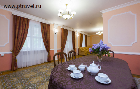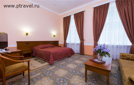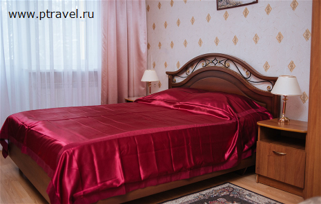 Номер квартирного типа с лоджией, прекрасно меблированный площадью 62 кв. м. В гостиной телевизор, мягкая мебель, в горке столовый сервиз. В одной спальной комнате две односпальные кровати, в другой – двухспальная. На кухне холодильник, электроплита, кухонный гарнитур. В номере 2 санузла с ванной и душевой кабиной, есть стиральная машина-автомат.