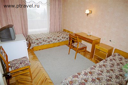 2-местный 1-комнатный 1 категории. Общая площадь номера 18 кв. м. В номере: две односпальные кровати, две прикроватные тумбочки, две настольные лампы, туалетный столик с зеркалом, холодильник, телевизор, гардеробный шкаф. Номера оснащены санузлом: душ, унитаз, умывальник, зеркальная полочка для туалетных принадлежностей, полотенца (банное, для лица, для ног). В прихожей встроенный шкаф, зеркало с полочкой. Балкон с видом на море и набором летней мебели.