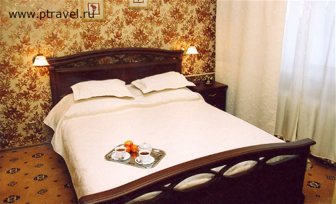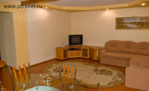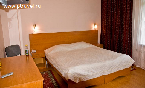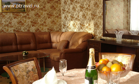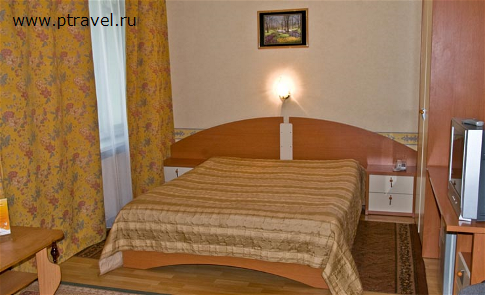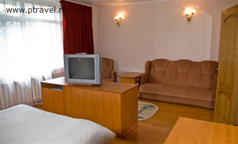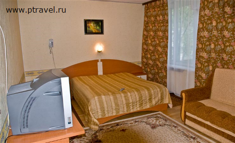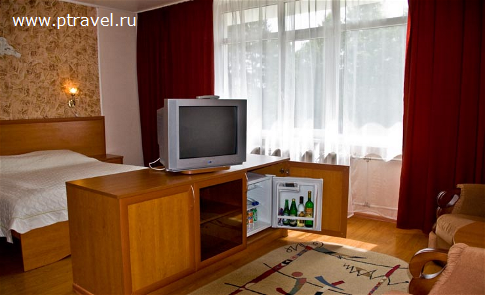 В номере: двуспальная кровать, прикроватные тумбочки и бра, 2-х секционный шкаф для одежды, диван-книжка, журнальный столик, телевизор (диагональ 54 см), телефон, кресло, мини-бар, ванная, туалетные принадлежности, фен.